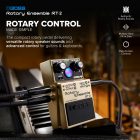 The most revered rotary speaker designs feature a spinning high-frequency horn (treble rotor) and a woofer that feeds into a rotating drum (bass rotor). Changing rotor speeds between fast and slow creates a steady stream of tonal shifts that players have long used for expressive effects. The RT-2 authentically replicates these audio behaviors, coupled with two-way speed control, a Rise/Fall Time switch for adjusting the transition time between speeds, and a colorful indicator that shows the current rotation of the virtual rotors.