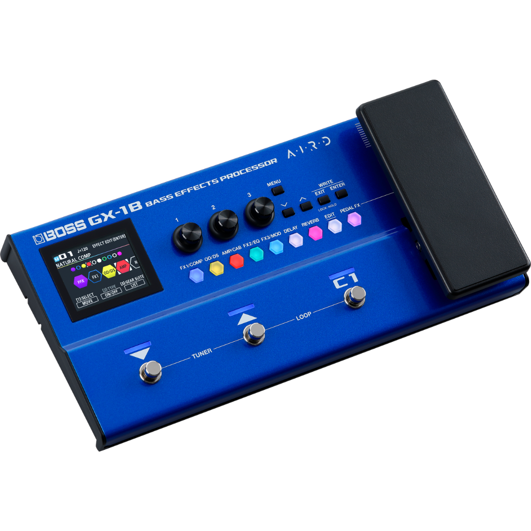 The GX-1B captures decades of our bass-focused sound development in one versatile processor. Explore 16 highly expressive AIRD amps, complemented by over 130 effects from the vast BOSS library. With adjustable effect order and eight simultaneous blocks plus a volume pedal and noise suppressor, you can easily craft custom setups for playing different music styles and performing specific songs on stage.